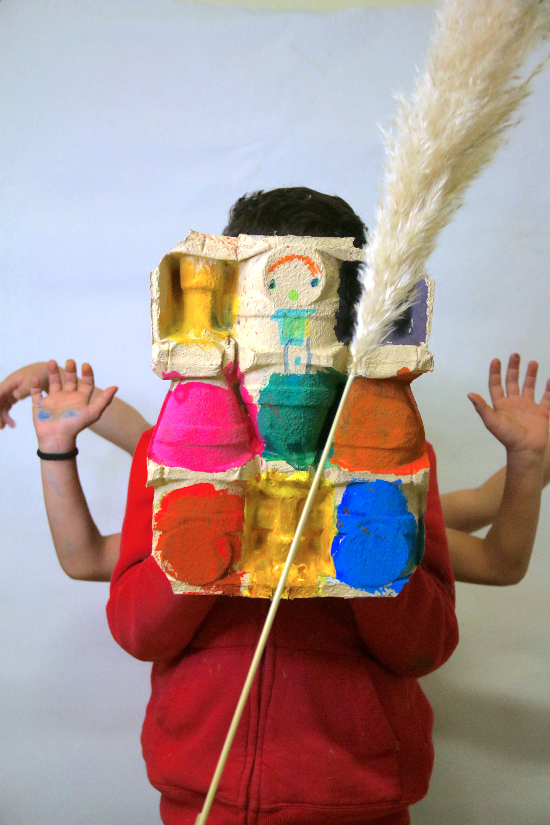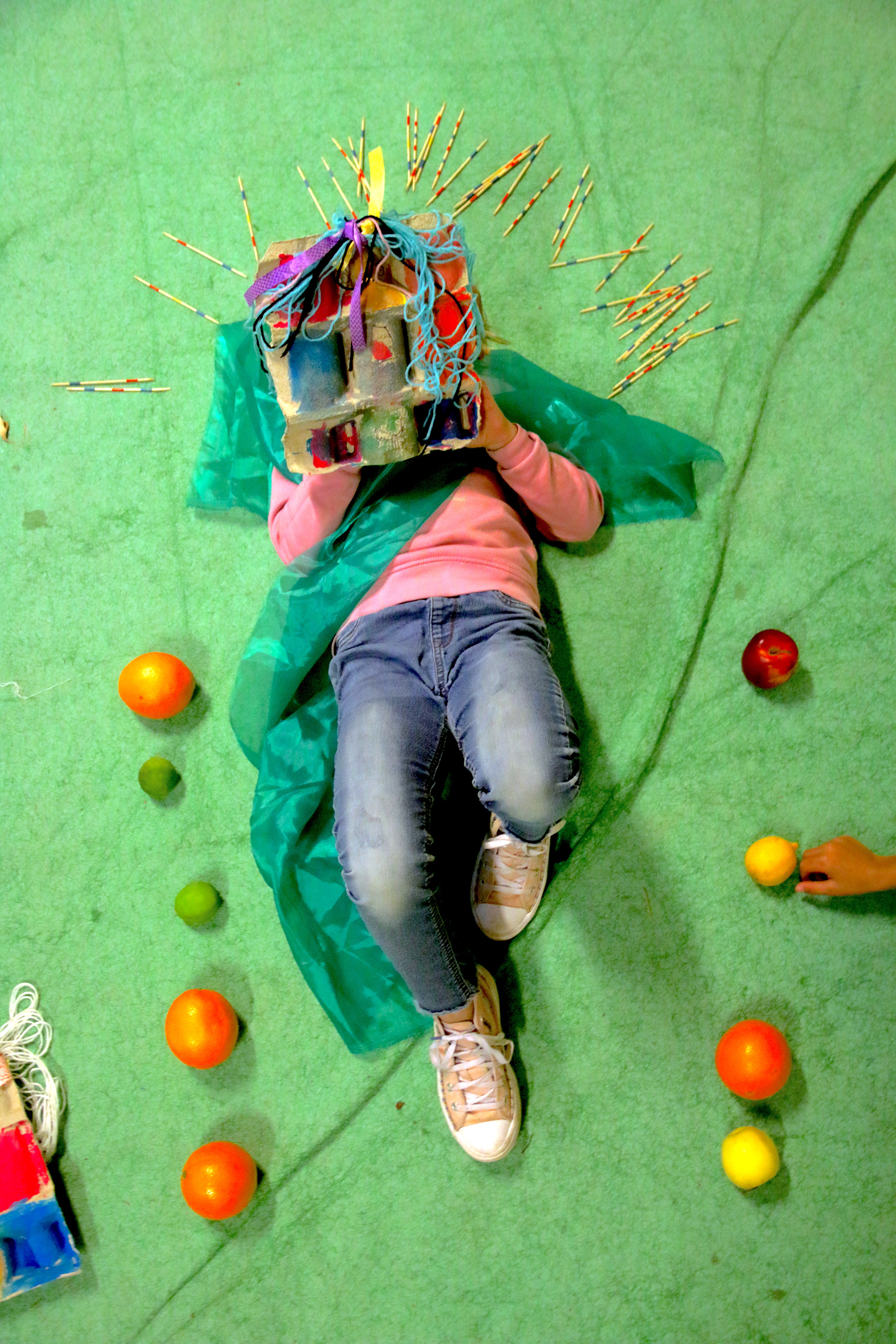 "Notre projet est celui de proposer aux enfants un atelier structuré en deux temps à la manière du cadavre-exquis, chaque intervenant propose donc un atelier différent. Le projet est de travailler avec les enfants sur l’idée de l’apparence, du “jeu”, du “double-jeu”, d’être acteur, du rôle. Les enfants expérimentent la notion de représentation au fil des ateliers."
